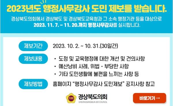 경상북도의회는 오는 11월 제343회 정례회 기간중에 실시하는 2023년도 행정사무감사를 앞두고, 도민들로부터 각종 의견과 제보를 받아 행정사무감사에 적극 반영하는 『도민 제보』를 운영한다.