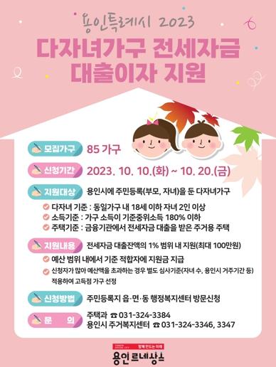 지원 대상은 부모와 자녀가 용인특례시에 주소를 등록한 85가구로 ▲동일 가구 내 18세 이하 자녀 2인 이상 ▲가구 소득이 기준 중위소득 180% 이하(4인가구 972만1735원) ▲금융기관에서 전세자금 대출을 받은 주거용 주택 거주자다.