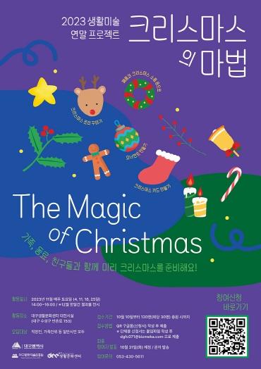 대구생활문화센터 대전시실에서 11월 4일부터 12월 30일까지 개최될 이번 행사는 가족과 연인, 친구 등이 모여 감성 가득한 크리스마스 장식을 함께 만들며 연말 분위기를 연출해보는 연말 프로젝트다. 참여자 각자 준비해온 재활용품과 소품을 이용하여 크리스마스트리, 리스, 장식품을 직접 만들어 전시실을 꾸며 보며 참여자 각양각색의 다양한 작품도 동시에 감상할 수 있다.