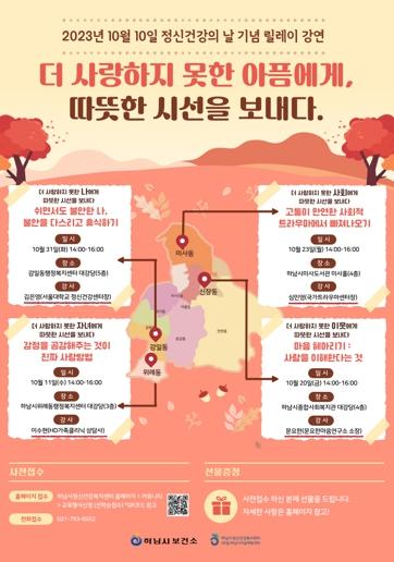 찾아가는 릴레이 강연은 우울증으로 진료받은 국내 인원이 역대 최초로 100만명을 넘어서는 등 국민 마음 건강에 적신호가 켜진 데 따른 조치로, 하남시는 ‘더 사랑하지 못한 아픔에게, 따뜻한 시선을 보내다’를 메인 주제로 삼고 정신건강 관리의 중요성과 자신과 타인에 대한 이해도 향상에 초점을 맞춘 강연을 진행한다.