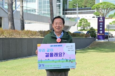 박현국 군수는 걷기 실천 응원 메시지를 작성하고 직원들과 군청 전정을 걸으며 걷기의 중요성을 홍보했다.