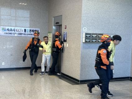 속초시가 지난 10월 5일 대포동 소재 동해안젓갈콤플렉스센터에서 속초소방서, 한국승강기안전공단, 승강기 유지보수 업체 및 속초시 승강기 안전관리자, 시민 등이 참석한 가운데 2023년 승강기 사고대응 합동훈련을 실시했다.