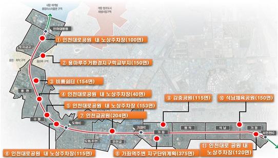 인천광역시는 인천대로(구. 경인고속도로)가 일반화 사업으로 생기는 도로 옆 노상주차장(1,600면)을 공원으로 전환하고, 주변 지역에 공영주차장 11개소 총 1,676면을 조성한다고 밝혔다.