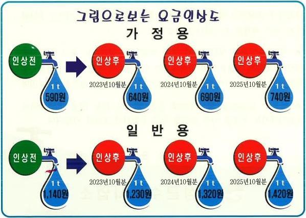 군은 그동안 정부의 공공요금 인상억제 정책과 물가안정을 위해 상수도 요금을 2017년부터 6년 동안 동결해 왔으나, 그동안 원가 대비 낮은 요금 현실화율로 만성 적자, 적기투자 미흡 등 경영여건 악화로 요금인상이 불가피해 연차적으로 3회에 걸쳐 요금인상을 시행(상수도요금 약 7.1%, 하수도요금 약 24.1%) 추진하기로 했다.