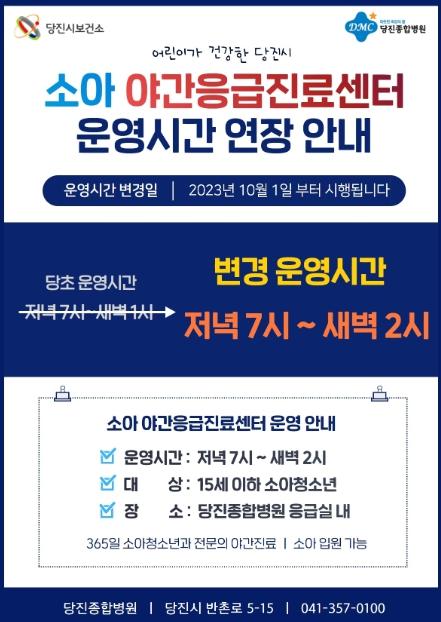 이에 당진시 소아 야간응급진료센터는 10월부터 소아청소년과 전문의 3인이 교대로 저녁 7시부터 새벽 2시까지 365일 소아 야간진료를 하고, 입원 병동 또한 지속 운영할 예정이다.