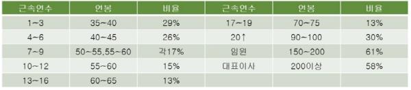 연차별 평균인상율은 4~5% 대가 가장 많았으며, 10년 미만 사원의 경우에는 6~9%, 10년이상의 사원의 경우에는 1~3%, 임원, 대표이사는 1%미만, 동결은 각 17%, 31%대로 조사 됐다.
