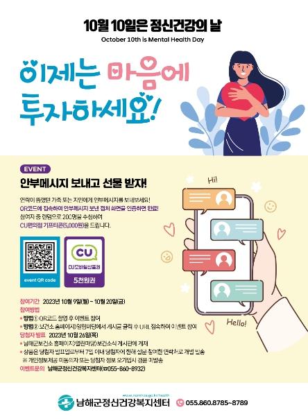 남해군에서는 군민 정신건강 증진을 위한 여러 가지 이벤트가 진행된다. 첫 번째로 온라인 소통 이벤트가 10월 9일부터 10월 20일까지 진행된다. 보건소 홈페이지 또는 남해군 페이스북에 게시된 QR코드를 통해 남해군민 누구나 참여 할 수 있으며, 가족 또는 지인에게 안부메시지를 보내고 설문에 응답하면 200명을 추첨하여 편의점 모바일 상품권(5,000원권)을 제공한다.