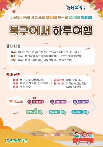 광주시 북구가 지역에 거주하고 있는 다문화가족을 대상으로 오는 21일부터 ‘북구에서 하루여행’ 프로그램을 운영한다고 10일 밝혔다.