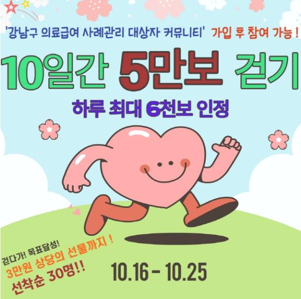 아울러 건강증진 특화프로그램으로 ‘하루 5천보, 10일간 5만보’ 걷기 챌린지를 16일부터 25일까지 진행한다. 집합교육 참가자들에게도 챌린지 참가를 독려해 걷기를 통한 건강관리를 실천하도록 할 계획이다. ‘워크온’ 모바일 앱에서 ‘강남구 의료급여 사례관리 대상자 커뮤니티’에 가입하면 승인 후 챌린지에 참여할 수 있다. 목표를 달성한 선착순 30명에게 3만 원 상당의 건강식품을 증정한다.