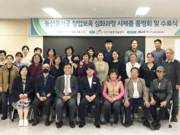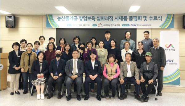 충남 서산시는 지난 10일 ‘농산물가공 창업보육 심화과정’을 마치고 서산시농업기술센터 제2강의실에서 수료생 29명이 참석한 가운데 수료생들이 직접 만든 농산물가공 시제품에 대한 품평회 및 수료식을 개최했다고 밝혔다.