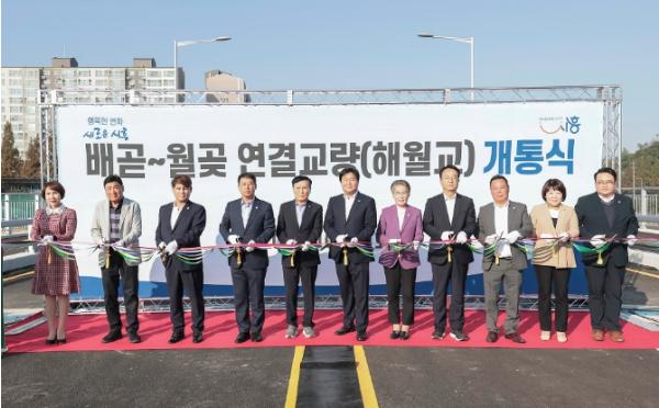 시흥시가 배곧에서 월곶을 잇는 ‘배곧~월곶 차도교 연결교량 설치공사’를 2020년 7월에 착공해 3년 만인 지난 9월에 준공했다. 이에 따라 배곧~월곶 간 연결교량(해월교)’을 11일 10시에 개통 운영한다고 밝혔다.