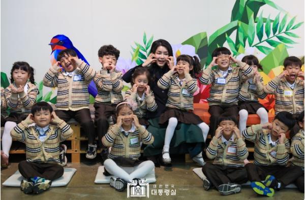 김 여사는 광주디자인비엔날레 연계 체험학습 프로그램 ‘더 리틀 큐레이터’ 행사에 참여한 20여 명의 유치원 아이들과도 만났다.