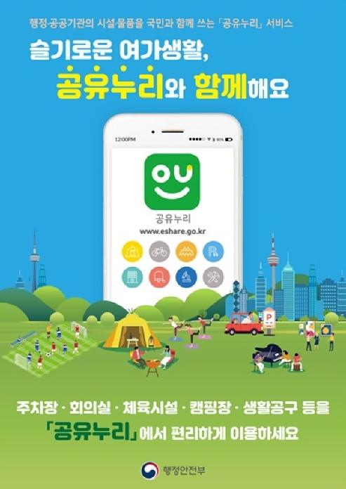 '공유누리'는 중앙행정기관, 지방자치단체, 공공기관 등 전국 475개 공공부문에서 국민에게 개방하는 회의실과 체육시설, 물품 등을 검색?예약하는 공유서비스 포털이다.