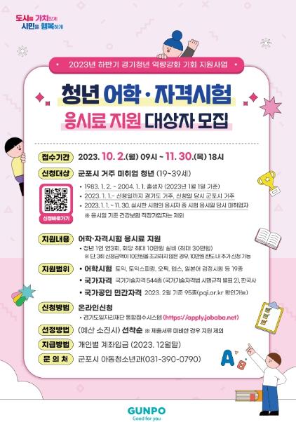 군포시가 취업 준비 청년을 대상으로 작년부터 시책으로 추진하던 어학·자격시험 응시료를 지원을 올해부터는 경기도 신규사업인 ‘경기청년 역량강화 기회지원 사업’으로 확대 추진해서 10월 2일부터 11월 30일까지 신청 받는다.