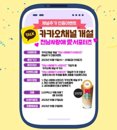 특히 오는 20일까지 10일간 채널 개설 이벤트를 진행한다. 전남 사랑애 서포터즈 채널을 구독 신청하면 즉시 응모할 수 있다. 응모자 중 추첨을 통해 500명을 선정해 5천 원 상당의 기프티콘을 증정한다.