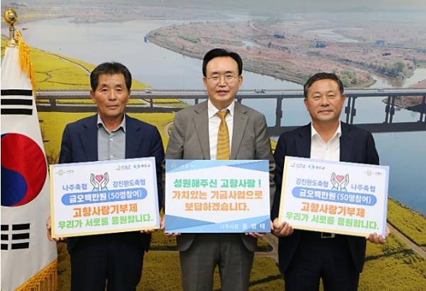 전라남도 나주시는 나주 축협과 강진완도 축협 조합장 외 직원 일동이 고향사랑 상호 교차 기부에 동참했다고 11일 밝혔다.