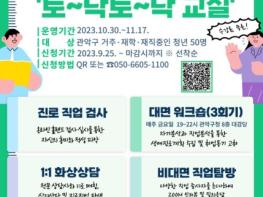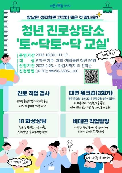 청년인구 1위 관악구(구청장 박준희)가 오는 10월 30일부터 11월 17일까지 관내 청년들을 위한 청년 진로상담소 ‘토닥토닥 교실’을 운영한다.