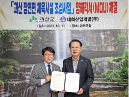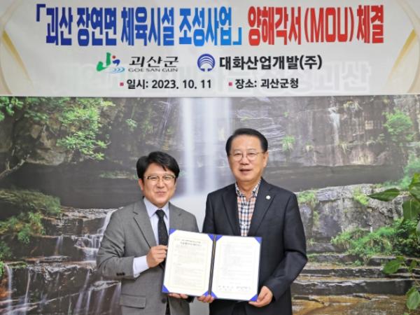 지난 11일 괴산군청 군수집무실에서 송인헌 군수와 이용 대화산업개발㈜ 대표이사 등 양측 관계자들이 참석한 가운데 체육시설 조성사업의 성공적인 추진을 위한 업무협약(MOU)을 체결했다.
