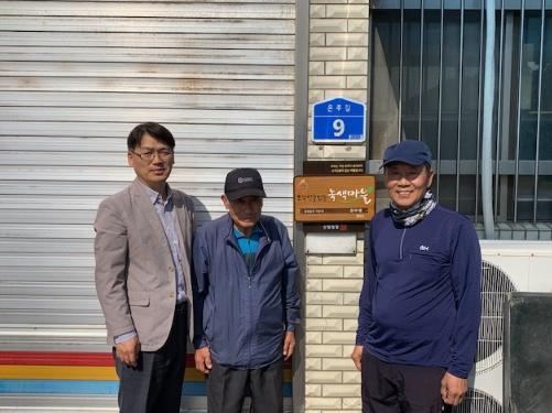 산림청에서 선정하는 ‘소각산불 없는 녹색우수마을’로 선정된 온양6동이 지난 12일 읍내1통 마을회관에서 녹색우수마을 선정 현판식을 하고 참여 주민의 노고에 감사를 전했다.