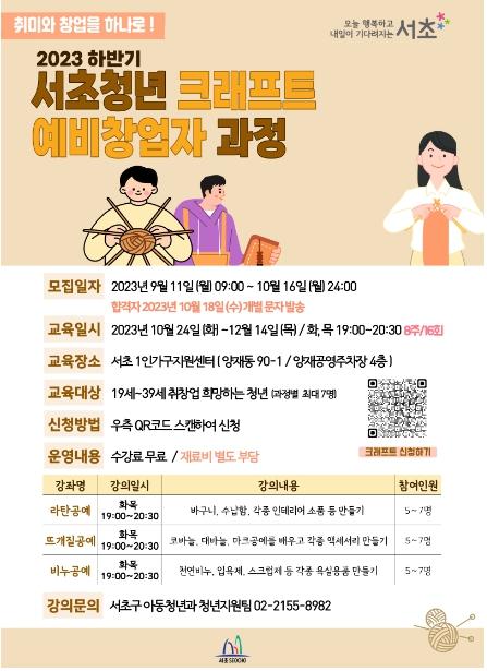모집 대상은 수공예에 관심있는 39세 이하 청년들은 누구나 가능하며, 포스터 내 QR을 통해 신청 가능하다. 최종 합격자는 오는 18일에 개별 안내 예정이며, 기타 자세한 내용은 서초구청 아동청년과로 문의하면 된다.