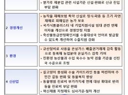 대표적으로, 청년인력 및 귀농인의 유입 촉진을 위해 자금지원 기준을 완화하고 정식·파종 등 초기 자연재해로 피해입은 농가를 보호하기 위해 농작물 재해보험에 특약을 신설하는 한편, 축산물등급판정 확인서를 수출대상국 언어로 발급할 수 있도록 함으로써 수출지원도 강화할 계획이다