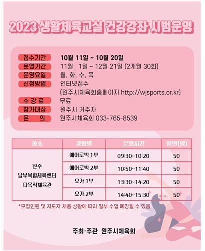 원주시와 원주시체육회는 코로나19로 인해 위축됐던 생활체육에 활기를 불어넣을 생활체육교실 건강강좌를 시범 운영한다.