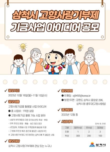 삼척시는 고향사랑기부제 기부금을 활용해 기부자와 시민이 공감할 수 있는 기금사업을 발굴하기 위해 오는 10월 16일부터 내달 15일까지 고향사랑기부제 기금사업 아이디어를 공개 모집한다.
