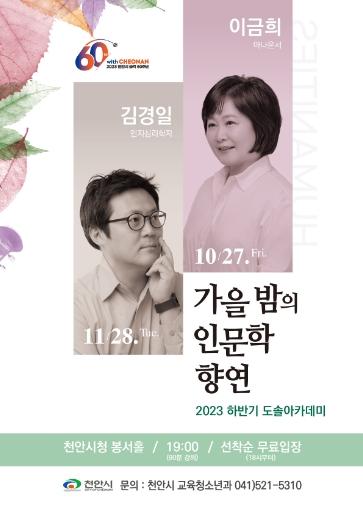 천안시는 가을을 맞아 시민들이 특별한 강의를 통해 삶의 쉼표와 힐링의 시간을 가질 수 있도록 ‘2023년 하반기 도솔아카데미’를 두 차례 진행한다.