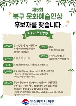 부산 북구는 올해 5회째를 맞는 북구 문화예술인상을 시상하기 위해 지역문화 진흥에 이바지한 문화예술인상 후보자를 추천 받는다.