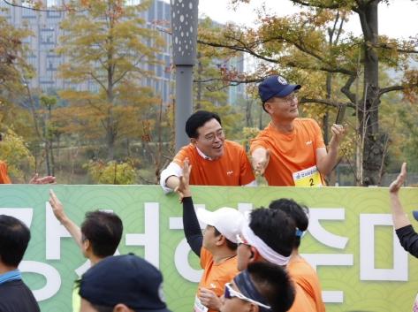 진교훈 서울 강서구청장이 14일 오전 2023 허준마라톤 대회를 찾아 참가자들의 안전한 완주를 기원하며 응원의 메시지를 전했다.