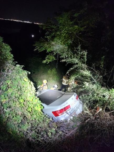 여수소방서가 15일 오후 19시경 여수시 율촌면 조화리 인근 산길에서 승용차가 비탈길을 따라 3m 아래로 추락하는 사고가 발생했다.