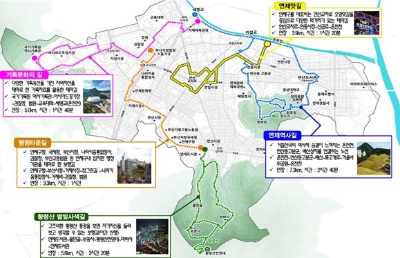 (연제구 둘레길 조성사업) 도심 내 자원을 활용한 테마형 둘레길 5개 구간을 조성하는 사업으로, 구간별 스토리텔링 및 콘텐츠 개발을 통한 둘레길 이용 프로그램 운영 등 일상생활에서 언제 어디서든 쾌적한 환경에서 걸어다닐 수 있는 보행길을 조성할 계획이다.