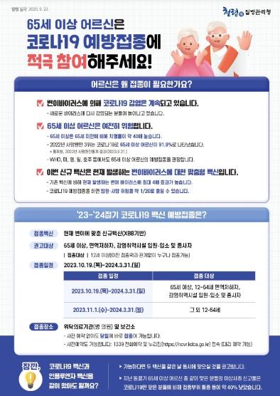 충북도는 10월 19일부터 접종 후 시간 경과에 따른 면역감소, 신규변이 유행 등에 대비하여 코로나19 무료 예방접종을 실시한다.