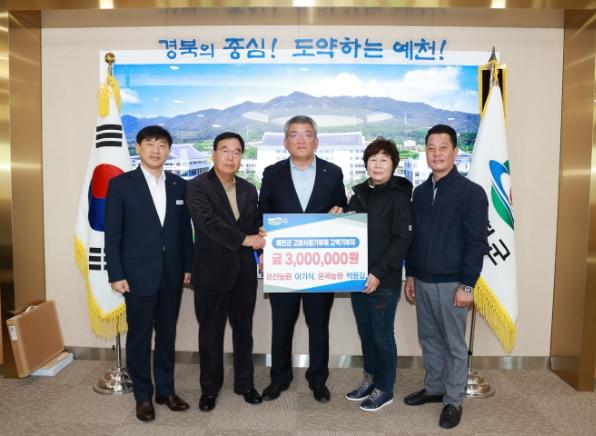 예천군은 지난 17일 운산농원 이기식 대표와 운곡농원 박용길 대표가 고향사랑기부금 총 300만원을 전달했다.
