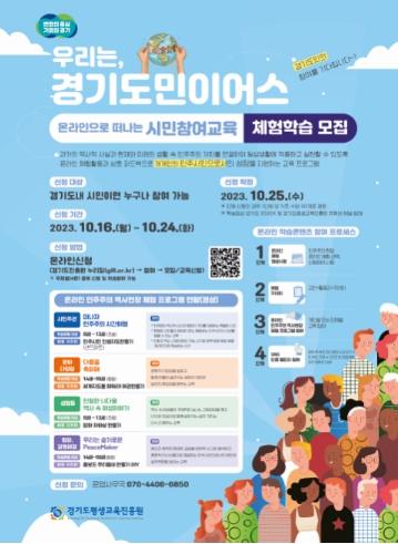 경기도평생교육진흥원은 10월 24일까지 다양한 시민참여 교육을 통해 올바른 시민의식 제고를 위한 ‘체험형 시민참여 교육’ 참여자를 모집한다.