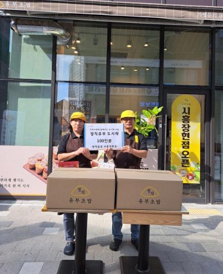 장곡동에 있는 정직유부 시흥장현점이 지난 18일 시흥시장곡종합사회복지관에 취약계층을 위한 유부초밥 도시락 100인분을 지정 기탁했다.