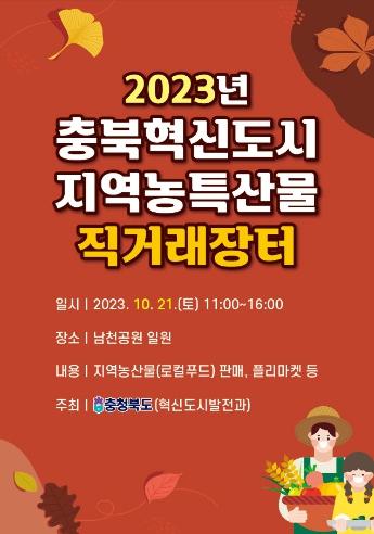 충청북도는 혁신도시 주민들에게 우수한 지역농특산물을 공급하고자 21일 충북혁신도시 내 남천공원에서 충북혁신도시 지역농특산물 직거래장터를 개최한다.