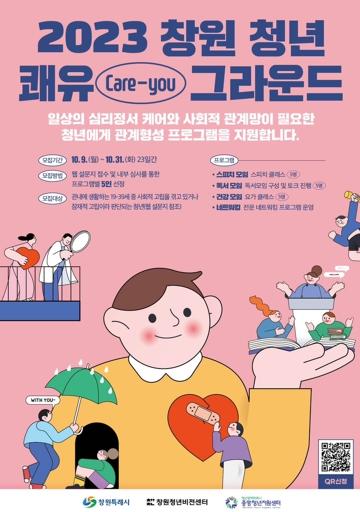 창원청년비전센터에서 10월 31일까지 고립청년에 대한 사회적 문제 인식 제고 및 저변 확대를 위한 ‘창원 청년 쾌유(Care-you) 그라운드’ 참여자 15명을 모집한다.