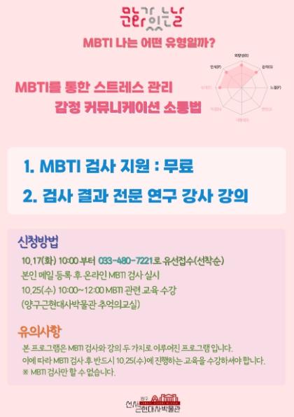 프로그램은 온라인 성격 유형(MBTI) 검사를 실시한 후 오는 25일 오전 10시부터 12시까지 양구 근현대사박물관 추억의 교실에서 성격 유형(MBTI) 검사 결과에 따른 전문 연구 강사의 강의로 진행된다.