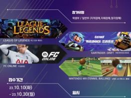 대회 종목으로는 ▲리그오브레전드 ▲카트라이더:드리프트 ▲닌텐도Wii Sport 테니스(개인전) ▲닌텐도Wii Sport 볼링(개인전) ▲피파온라인4이며, 번외로 e스포츠 체험 부스 운영 및 관내 학생들을 위한 어울림 대회도 마련될 예정이다.