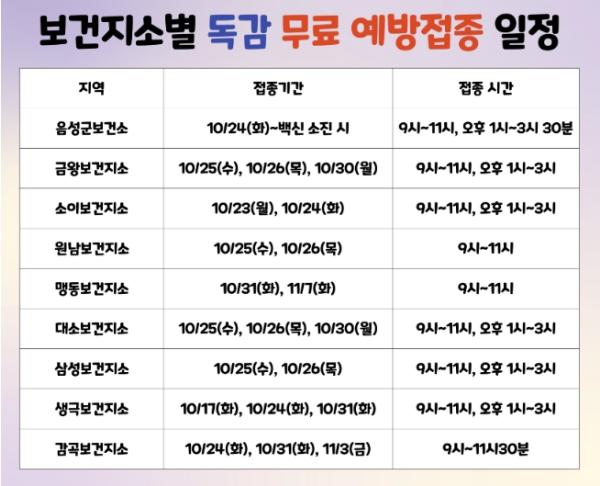 음성군은 독감(인플루엔자) 유행을 대비하고 취약계층의 접종 비용 부담 완화를 위해 독감 무료 예방접종을 실시한다고 20일 밝혔다.