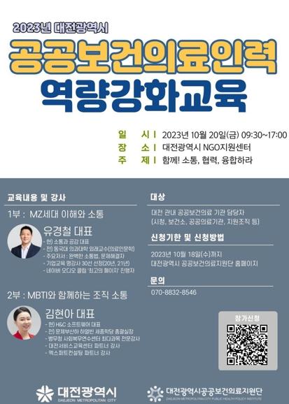대전시는 관내 공공보건의료기관 및 공공보건의료 지원조직의 협력체계 강화와 공공보건의료 담당자의 직무역량 향상을 위해 ‘2023년 대전 공공보건의료인력 역량강화 교육’을 20일 대전광역시 NGO지원센터에서 개최했다.