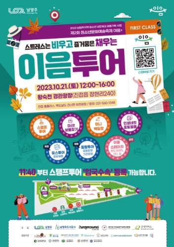 작년에 이어 두 번째로 개최되는 이번 축제는 21일 오후 12시부터 4시까지 남양주시 진접읍 왕숙천 경관광장에서 진행된다. 스트레스는 비우고 즐거움과 유익함을 채우자는 여행 컨셉을 주제로 힐링투어, 유스(동아리)투어, 푸드투어와 같은 다양한 문화체험 부스가 운영되고 스탬프 투어, 보물찾기 미션 등이 진행될 예정이다.
