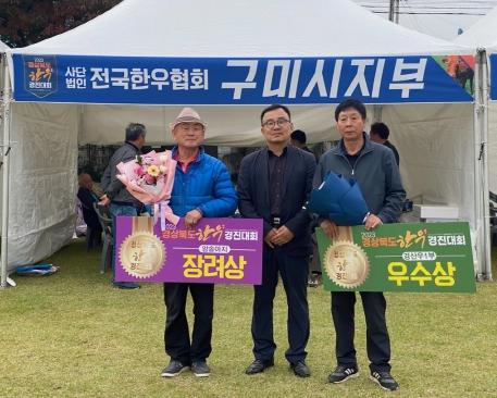 시는 구미칠곡축협, 한우협회 대표들과 사전심사를 통해 3농가 4두를 선발해 출품했으며, 송아지 부문 산동읍 김도완 농가(장려상), 경산우1부 부문 고아읍 김화연 농가(우수상)가 선정됐다. 지난해에는 2개 부문(미경산우, 경산우3부) 최우수상을 받아 최우수시군으로 선정된 바 있다.