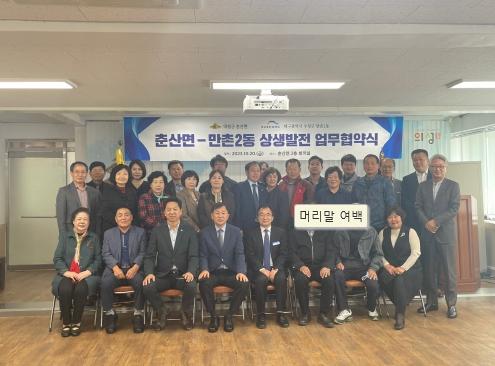 이번 협약식에는 김남우 만촌2동장, 박용석 춘산면장, 김동호 만촌2동 주민자치위원장, 김용표 춘산면 이장협의회장 등 양 지역의 주요 협력단체장 등 30여 명이 참석했다.