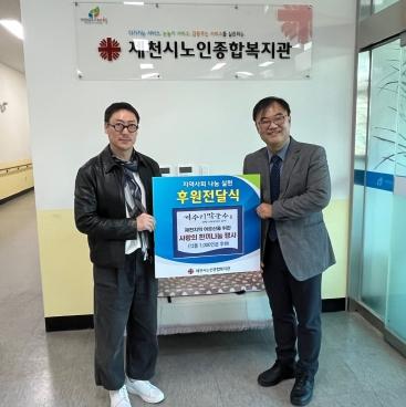 이날 개수리막국수에서는 제천지역 어르신들을 위한 한끼나눔 행사를 위해 본사 임직원들이 복지관을 직접 방문하여 후원물품을 전달했다.