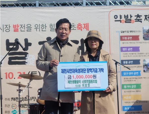 제천생활음악 사회적협동조합은 지난 21일 개최된 약초시장 발전을 위한 축제“약발축제”에서 제천시인재육성재단에 문화 예술인재 양성을 위한 장학금 100만원을 기탁했다.