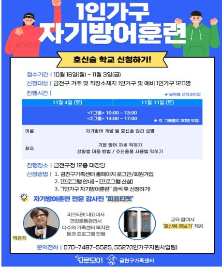 금천구는 금천구 가족센터(이하 센터)에서 11월 4일과 11일 ‘1인가구 자기방어훈련’을 운영한다고 밝혔다.