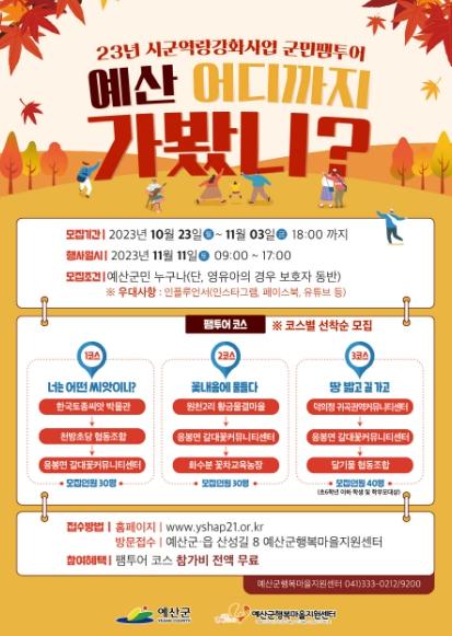 예산군행복마을지원센터는 예산군의 대표적인 관광지 뿐만 아니라, 마을 곳곳의 다양한 볼거리, 즐길 거리, 체험 거리를 새롭게 발견하고 알아가는 ‘예산 어디까지 가봤니?!’ 군민 팸투어에 참가할 주민을 오는 11월 3일까지 모집한다고 밝혔다.