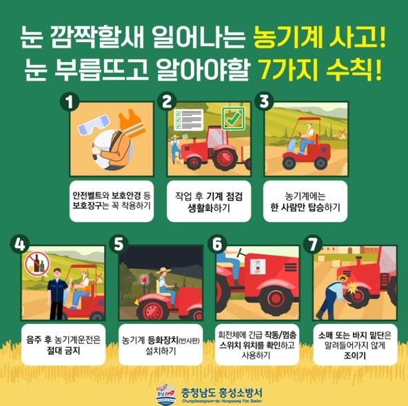 홍성소방서는 농기계 사용이 증가하는 가을철 수확기를 맞아 농기계 안전사고에 대한 각별한 주의를 당부했다.